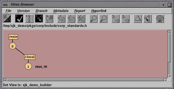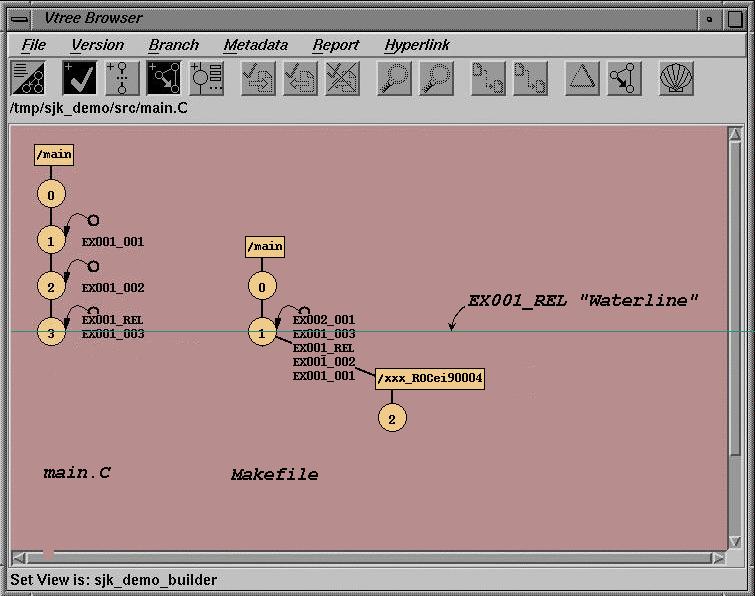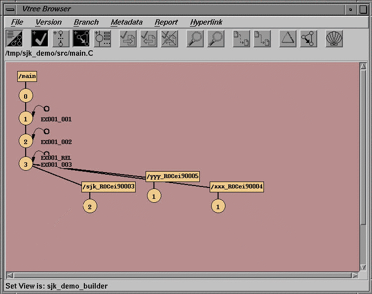 Note that all the program sources which are under the example project's control have been marked with EX001_REL, the label for the initial Release of the program. You can think of the label as a "slice" or "high water level" through the version tree of all three files in the program. (For items which are outside of the project's control--for example, items which are shared among several projects--we use the labeled baselines provided by the producer of those items. In our example, to reference file corp_standards.h which has been provided by a different organization, we use the PKGS_90 label.) This is illustrated by executing a Cleartool ls command: